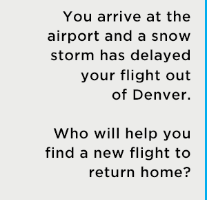 You arrive at the airport and a snow storm has delayed your flight out of Denver. Who will help you find a new flight to return home? With travel delay coverage, you will have benefits to help with the expenses of the new flight and your family's stay in a comfortable hotel.